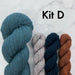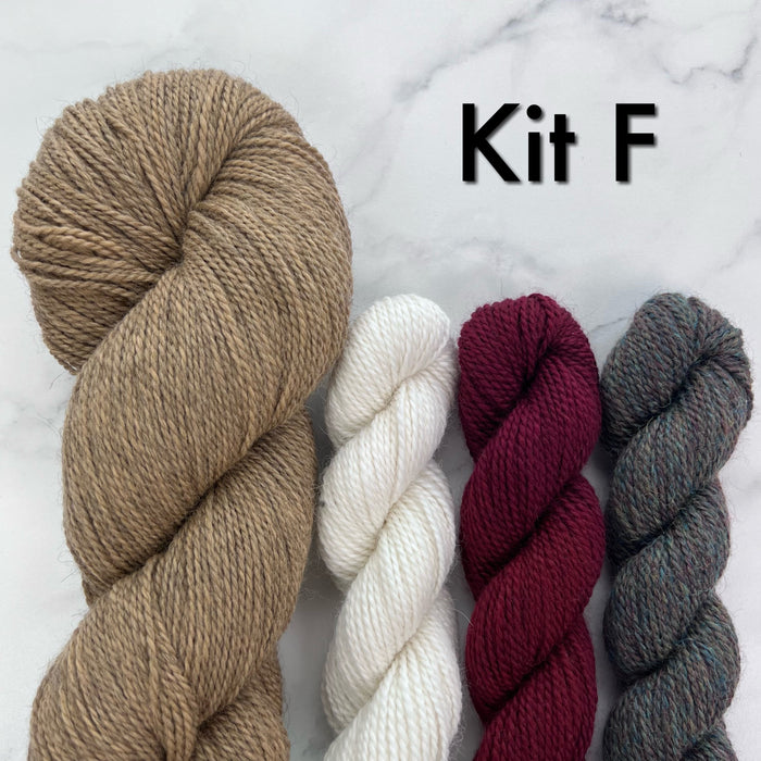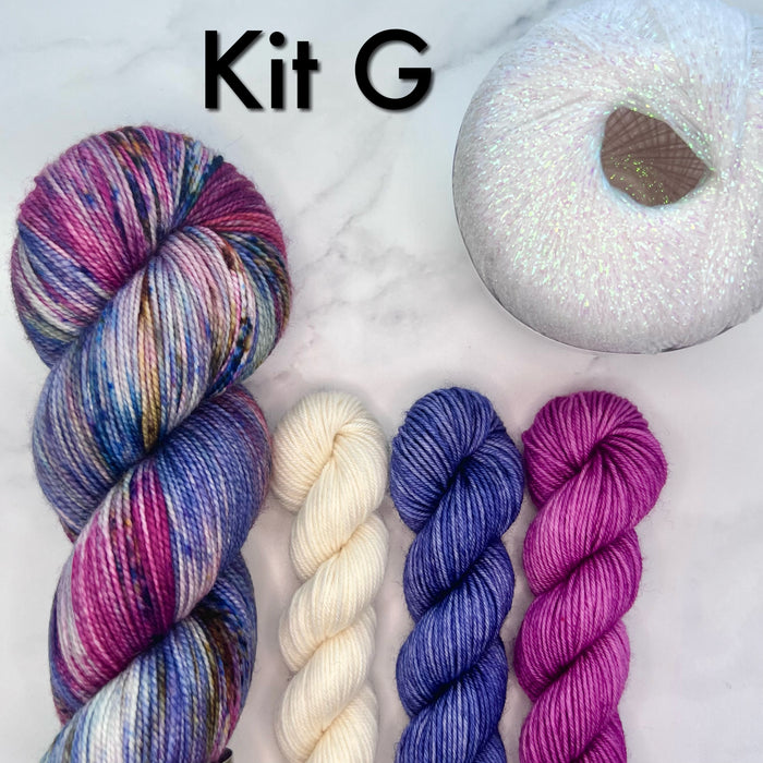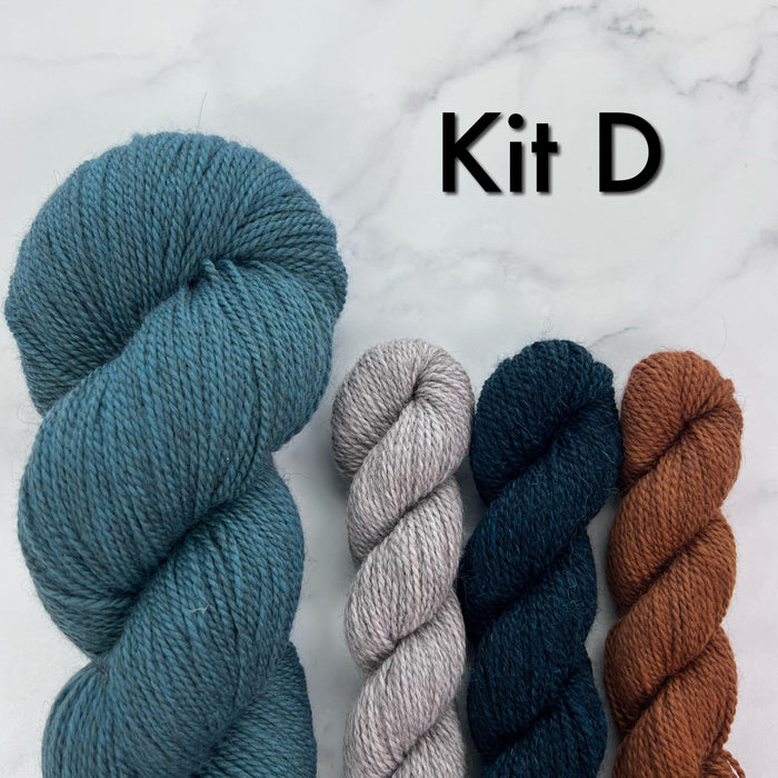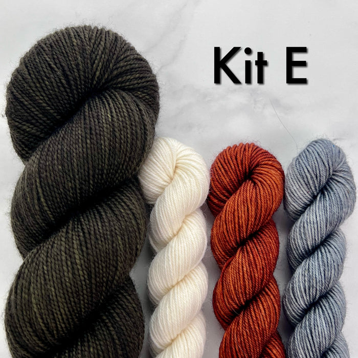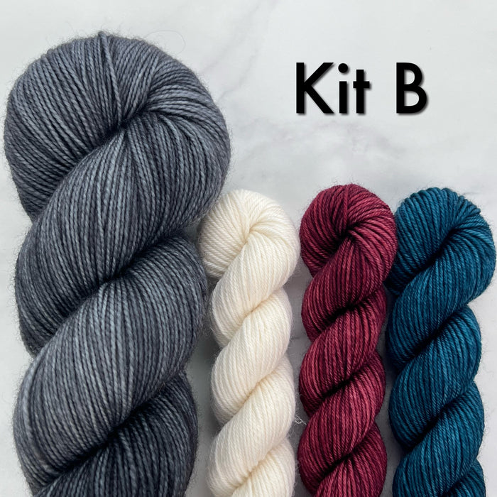 All kits include fingering weight yarn as listed below.