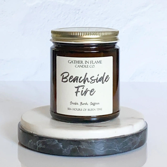 • 7.3 ounce candle in amber glass jar with gold lid.